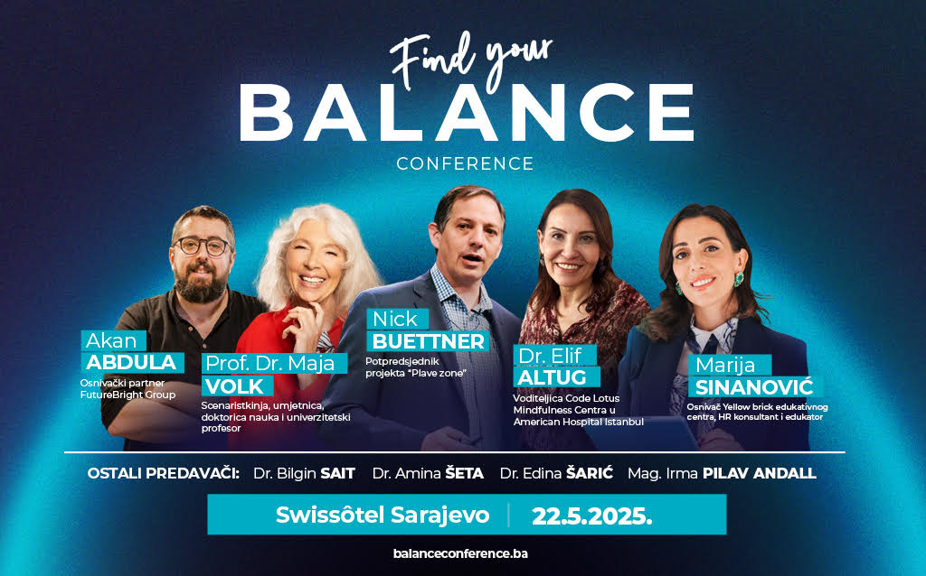 Dođite ako ste zaboravili kako izgleda jutro bez grča u stomaku. Ako ste se umorili od trke. Ako ste shvatili da je vrijeme da se vratite i posvetite sebi. Ne obećavamo čuda. Ali obećavamo znanje, iskustvo i zajednicu koja razumije. Zainteresovani se mogu prijaviti putem zvanične web stranice konferencije: https://balanceconference.ba/.