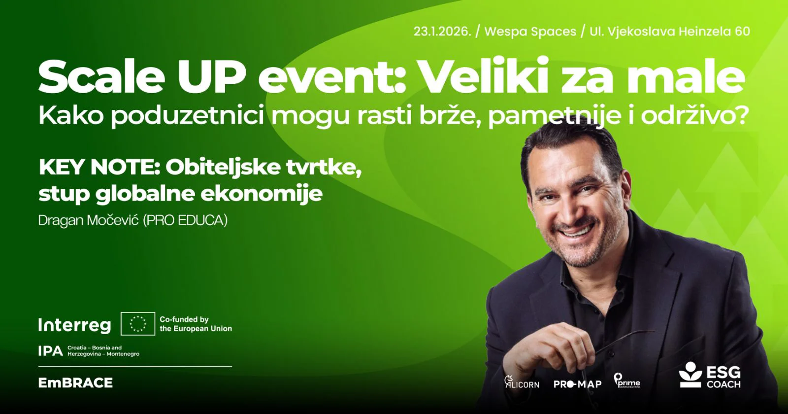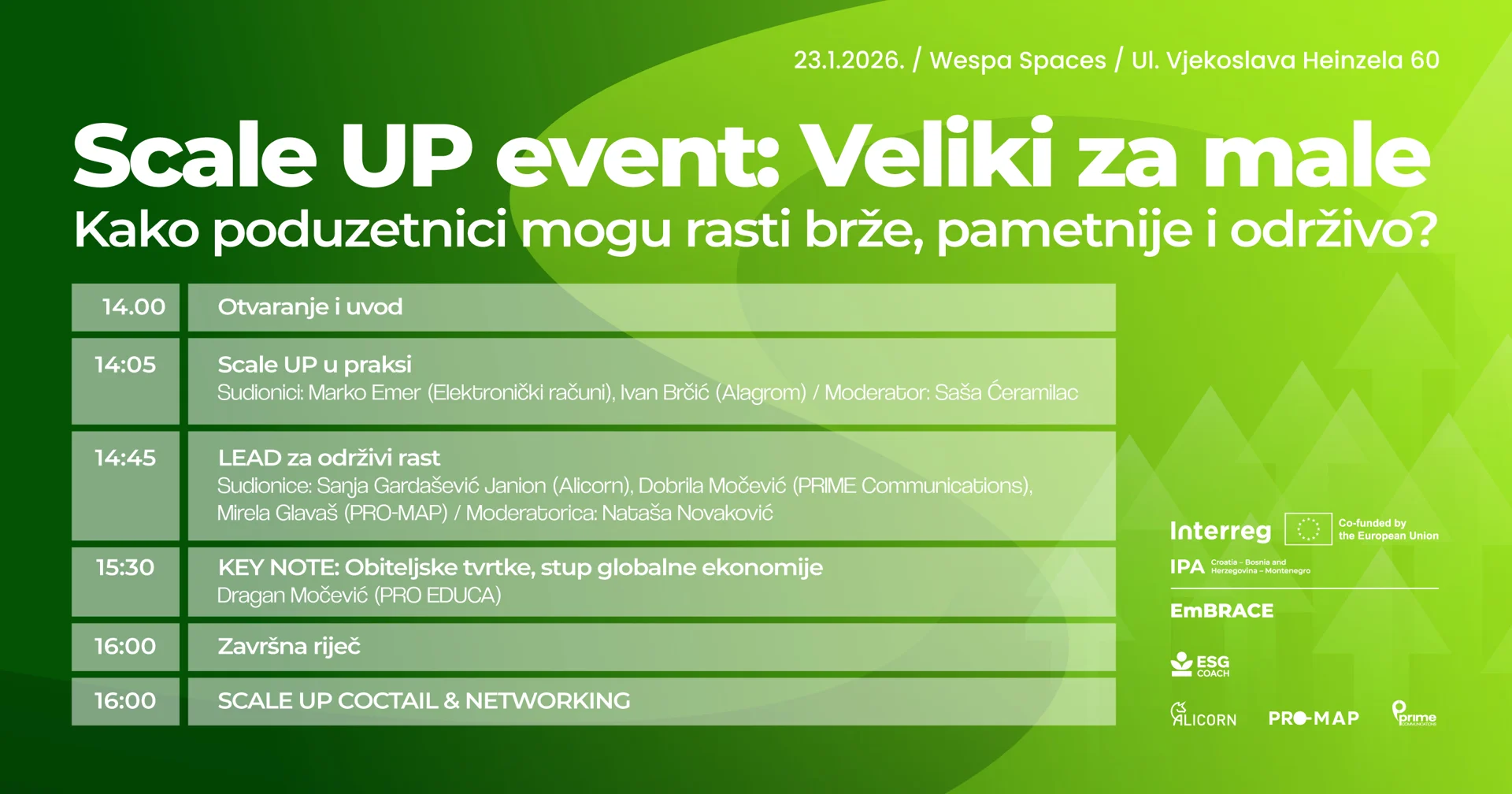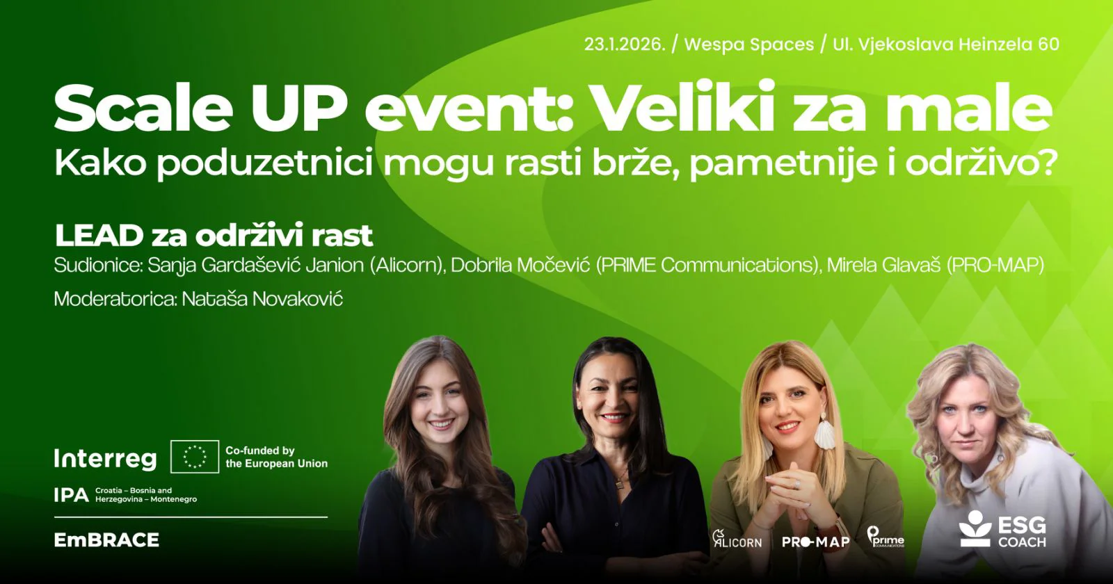 Završni događaj LEAD projekta održaće se 23. januara 2026. godine u Zagrebu, od 14 sati u prostoru Wespa Spaces, pod nazivom Scale UP event: Veliki za male – Kako preduzetnici mogu rasti brže, pametnije i održivo? Uvodni razgovor o Scale UP partnerstvima u praksi kroz konkretne primjere saradnje velikih kompanija i ambicioznih malih biznisa aktivno uključuje publiku. Centralni dio programa posvećen je LEAD projektu i održivom rastu, s fokusom na ESG Coach kao alat koji povezuje strategiju, praksu i dugoročnu konkurentnost. Program se nastavlja keynote izlaganjem o ulozi porodičnih firmi kao stubova globalne ekonomije, a završava neformalnim Scale UP networkingom, osmišljenim kao prostor za razmjenu iskustava, povezivanje i otvaranje novih saradnji. Broj mjesta je ograničen, a prijava obavezna putem online prijavnice. Događaj je namijenjen preduzetnicima/ama, predstavnicima kompanija, stručnjacima i svima koji žele razumjeti kako održivost i rast mogu ići zajedno, kada se grade na znanju, povjerenju i dugoročnim odnosima.
