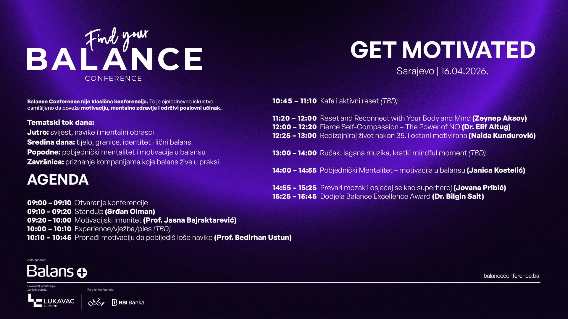 Nakon izuzetno uspješne prve konferencije, koja je okupila više od 300 učesnica i učesnika i otvorila važne razgovore o stresu, balansu i dugovječnosti, Balance Conference 2026 donosi još snažniji i sadržajniji program s fokusom na unutrašnju motivaciju, otpornost i održivi uspjeh – bez burnouta.