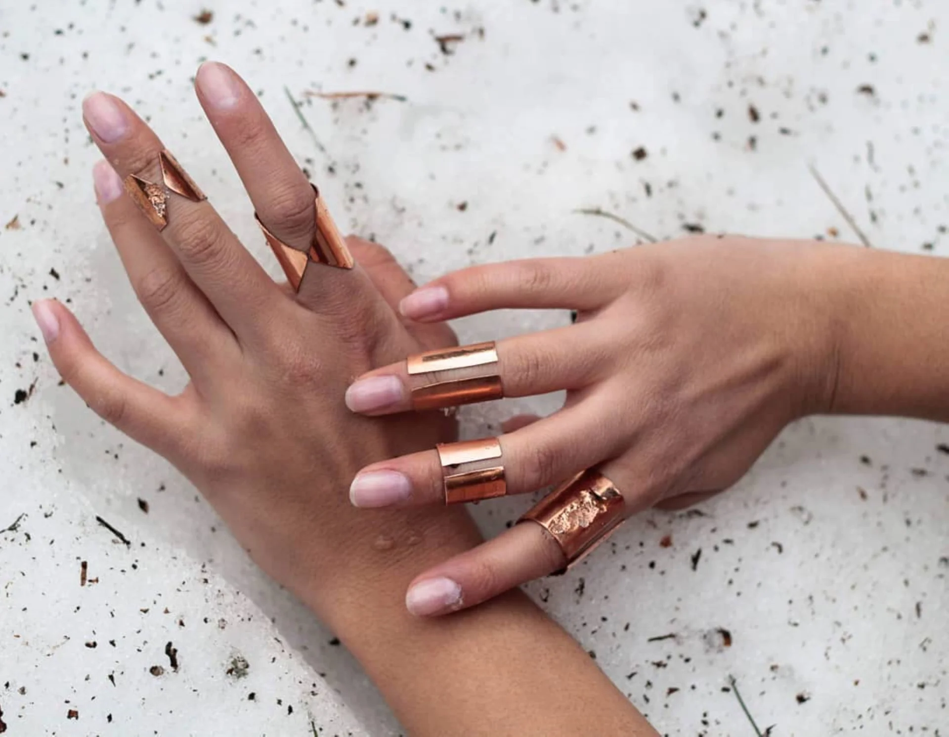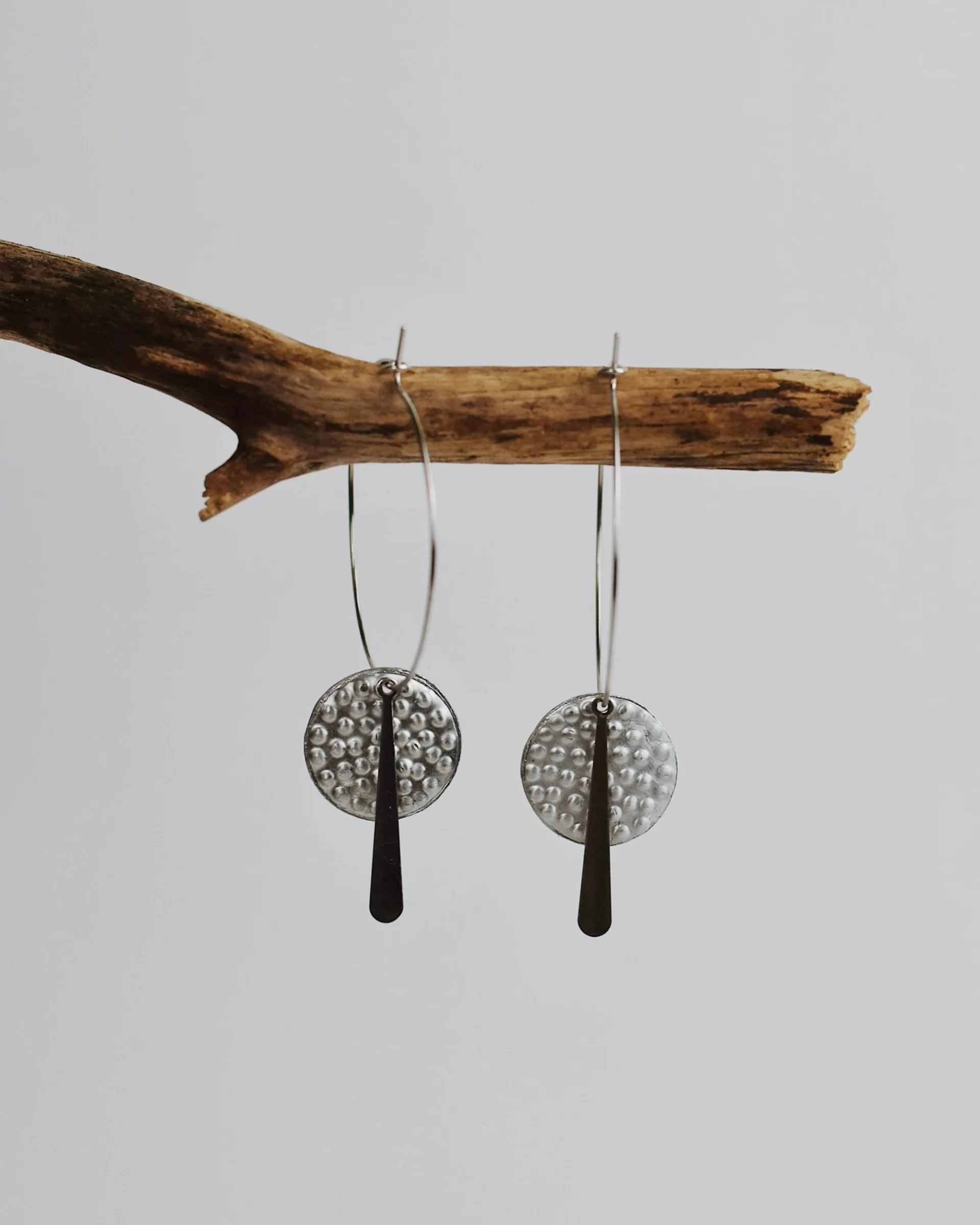 Asortiman naših proizvoda uključuje naušnice, prstenje i ogrlice, izrađene prvenstveno od metala poput cinka, mesinga i bakra. Specifičnost leži u spoju tradicionalnih materijala i modernog dizajna. Metal obrađujemo ručno – savijamo, teksturiramo i oblikujemo – čime svaki komad dobija jedinstven izgled.